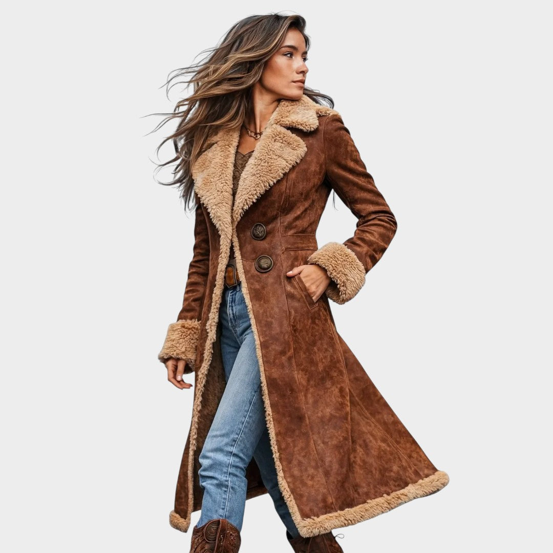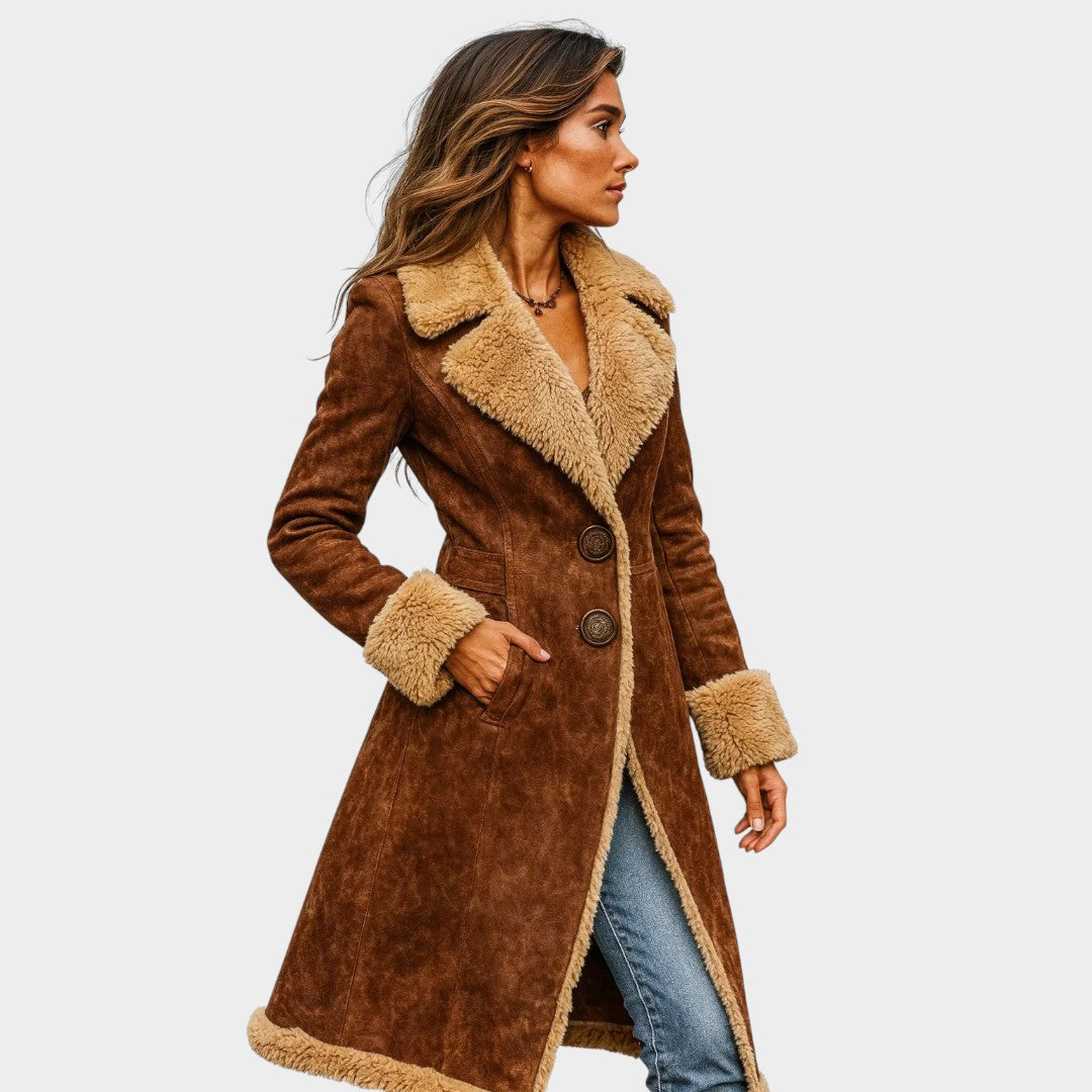 Abrigo largo de estilo vintage con acabado efecto ante y forro cálido que aporta elegancia y carácter en los días fríos.