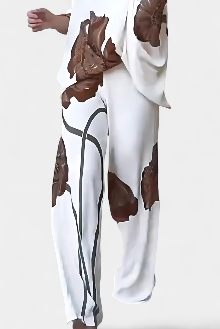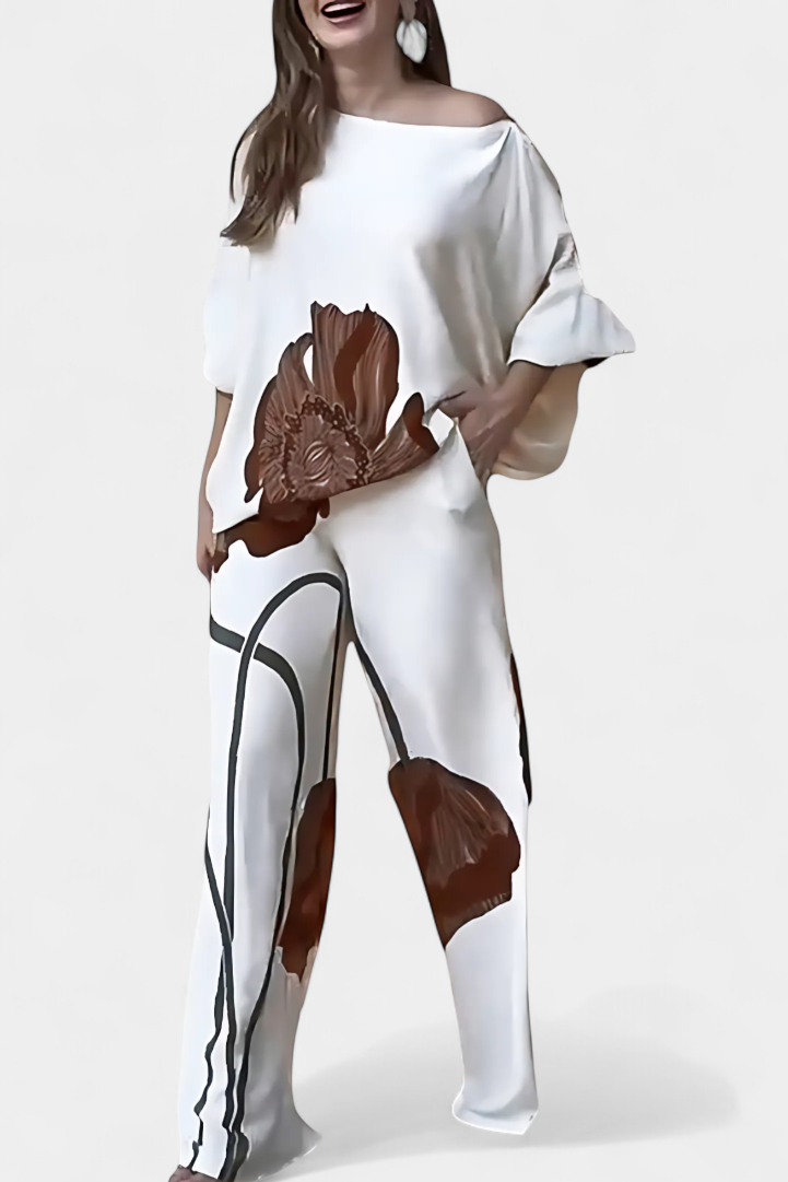 El conjunto Jessie fusiona un top asimétrico de manga murciélago con un estampado floral llamativo y un pantalón recto de ajuste holgado.